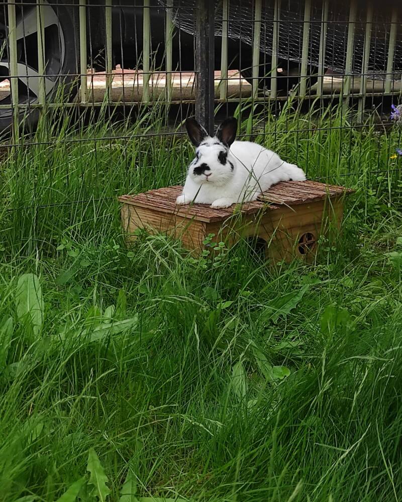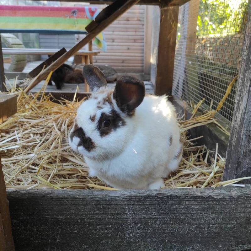 Pauli kam mit seinem Bruder Kevin zu uns, beide wurden schnell zu Dauerbewohnern. Leider mussten wir Pauli im August 2024 gehen lassen, da er aufgrund seiner Qualzucht ein sehr schlimmes Gebiss hatte und wir ihm nicht mehr helfen konnten. Er war eine loyale Seele und hat seine Kaninchenfreunde immer sehr geliebt.